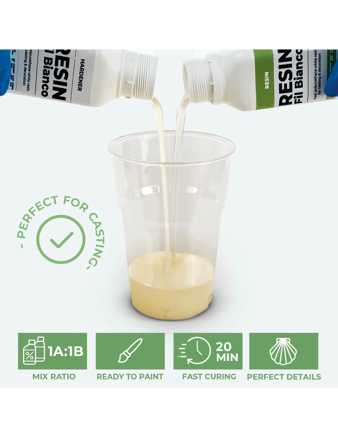 ✔️OTTIME PROPRIETÀ MECCANICHE: la sua viscosità permette di colare senza inglobare bolle d’aria, consentendo un’ottima lavorabilità sia in superficie che con stampi in silicone.