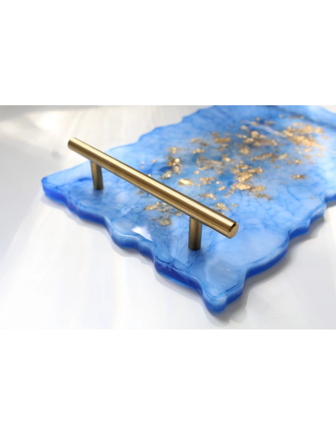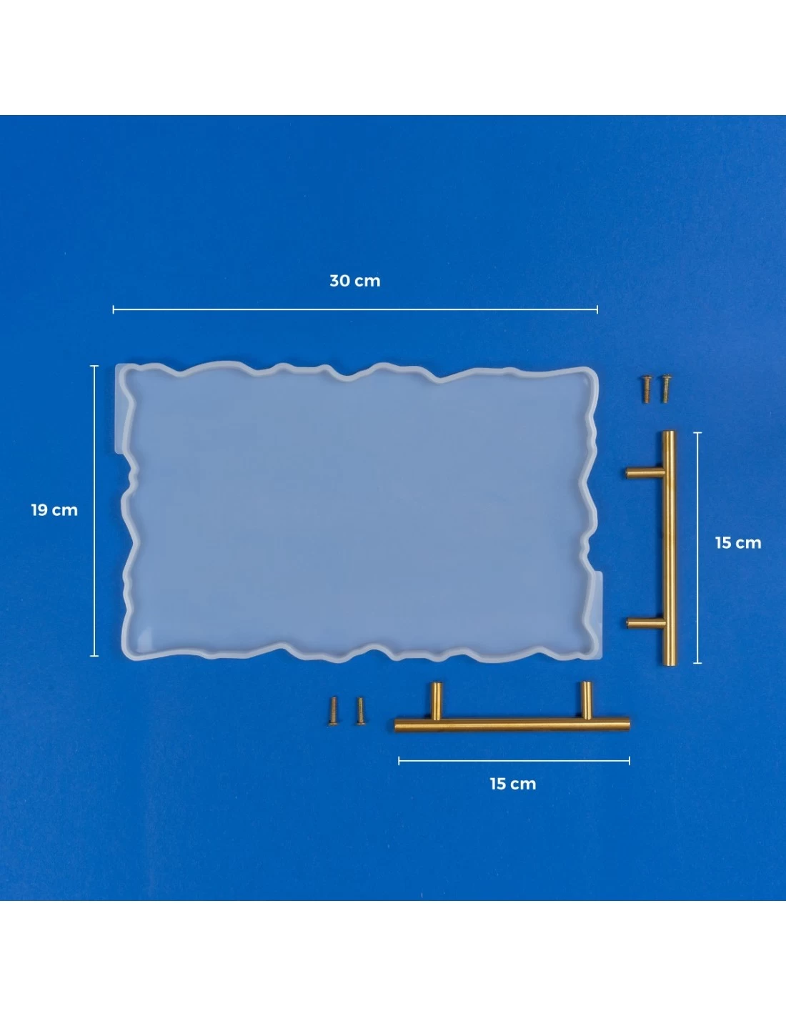 Set composto da 1 stampo in silicone trasparente e due manici in metallo color ottone per realizzare un elegante vassoio.