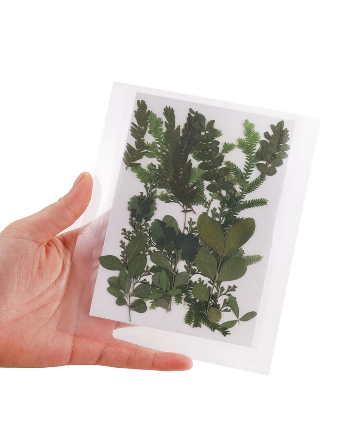 Una collezione di foglie dal colore verde acceso composto da Acacia Farnesiana, Foglie di Crisantemo Selvatico, Stenolomachusanum, Hydrocotyle Chinensis, Caesalpinia Decapetala, Pistacia Weinmannifolia, Lycopodium Japonicum Thunb.