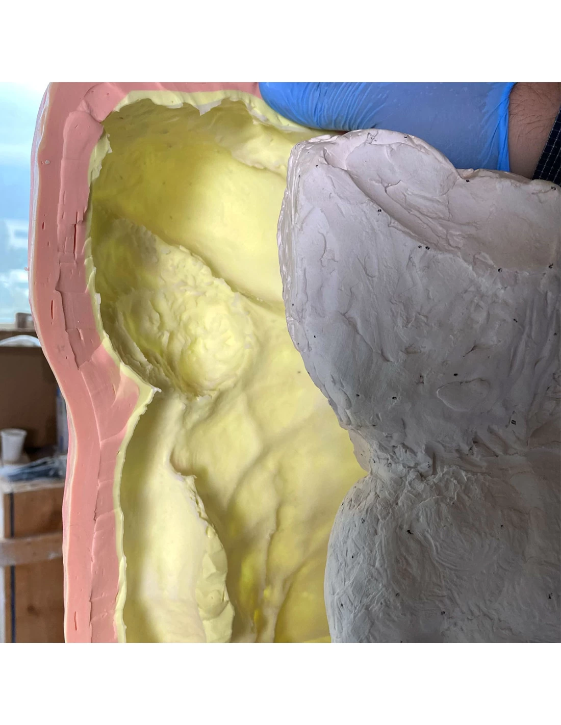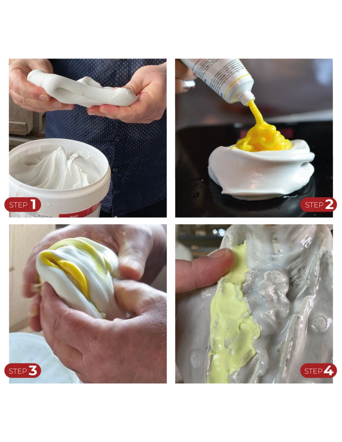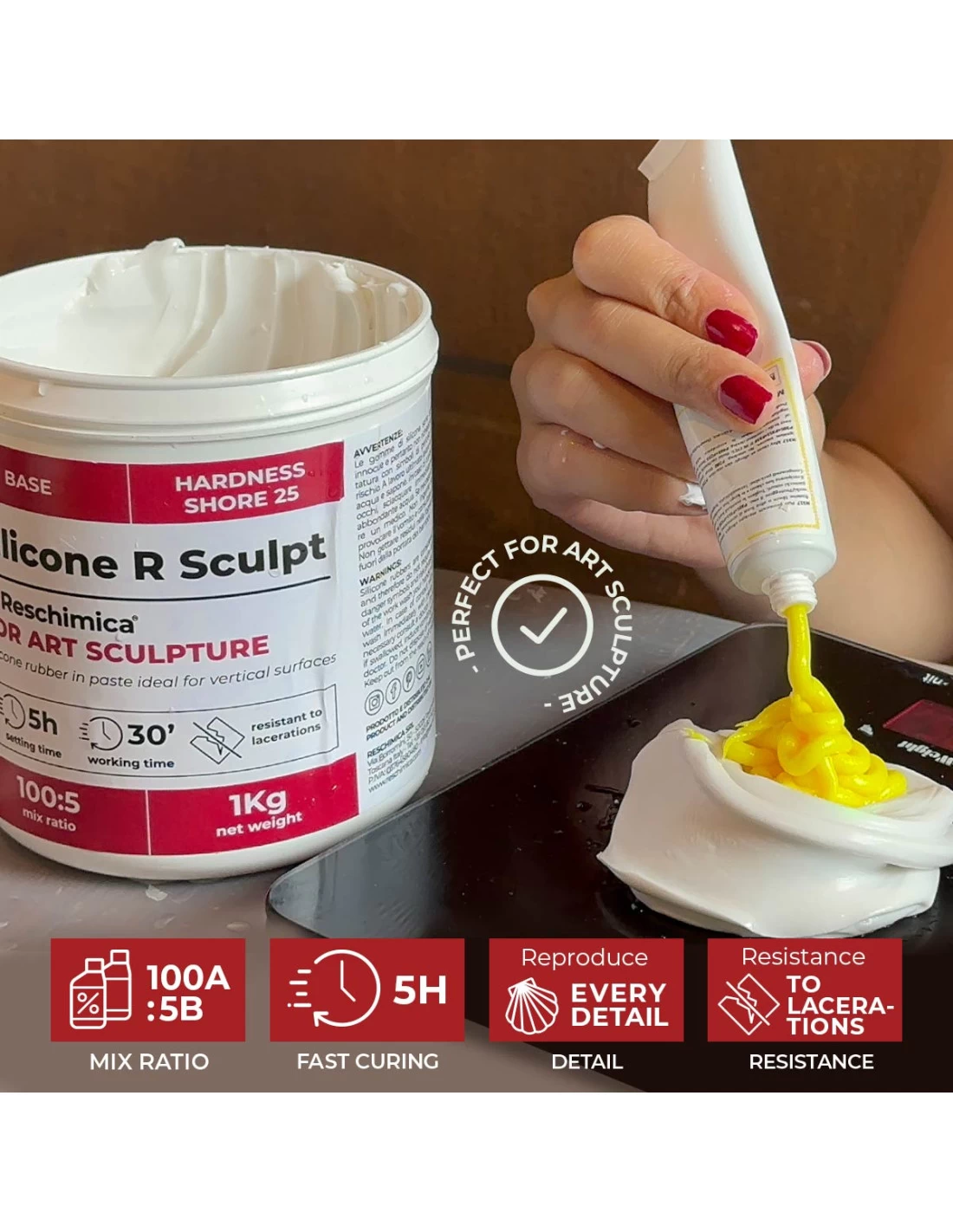 Per usare la gomma per sculture R SCULPT, bisogna prendere i due componenti Base (colore grigio chiaro) e Catalizzatore C Art (colore giallo) e miscelarli, finchè il colore ottenuto sarà omogeneo. R SCULPT è una gomma atossica, che può essere utilizzata a mani nude. Le mani devono essere sempre umide (quasi bagnate) in modo da facilitarne l’utilizzo.