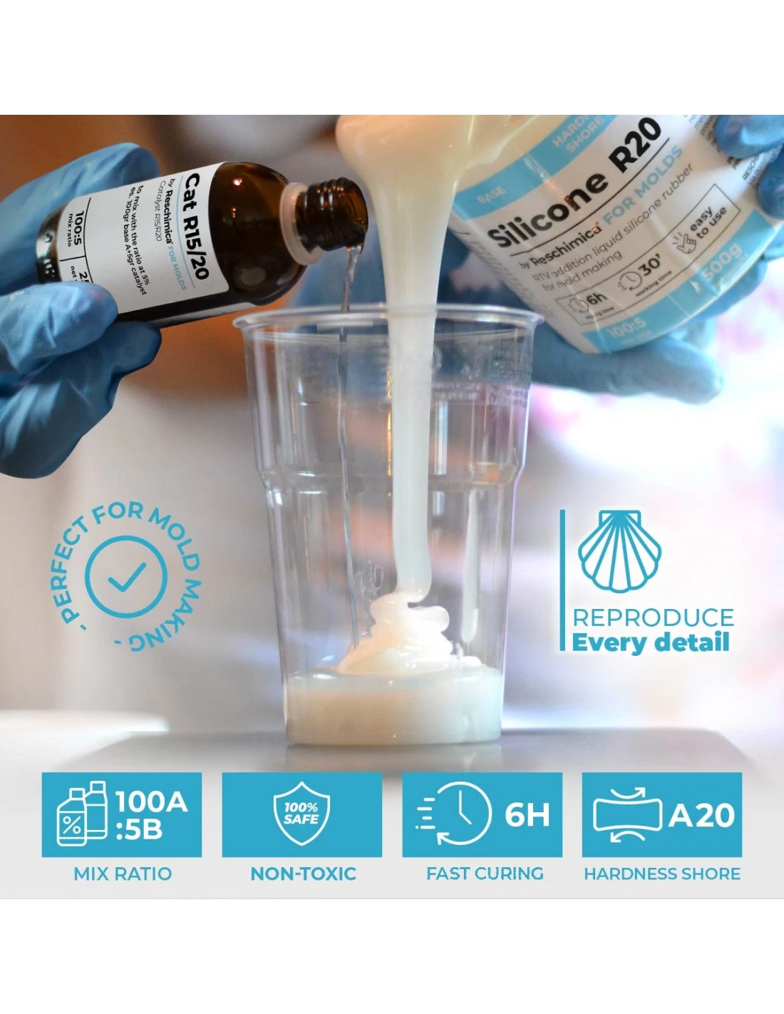 Grazie alla sua altissima resistenza alla lacerazione, R20 consente di creare stampi in gomma siliconica di media durezza anche complessi, a differenza delle resine, in cui i piccoli dettagli riprodotti rischiano di rompersi nella fase di de-molding (ovvero quando si estrae il modello dal calco). Particolarmente indicata per realizzare oggetti e creazioni in gesso, resine, cera, sapone e cemento, questo silicone inodore consente di realizzare stampi di qualsiasi tipologia e dimensione poiché, rispetto alle gomme della linea RPRO, non ha problemi ad entrare in contatto con nessun materiale.