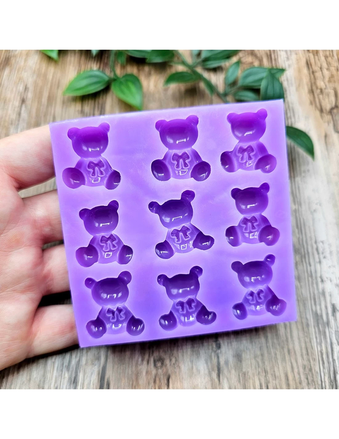 Stampo flessibile orsetti con fiocco. Realizzato a mano in silicone atossico, questo stampo è ideale per lavorare con resine, cera, sapone e altri materiali. Perfetto per decorazioni, bomboniere, progetti di artigianato e regali personalizzati.